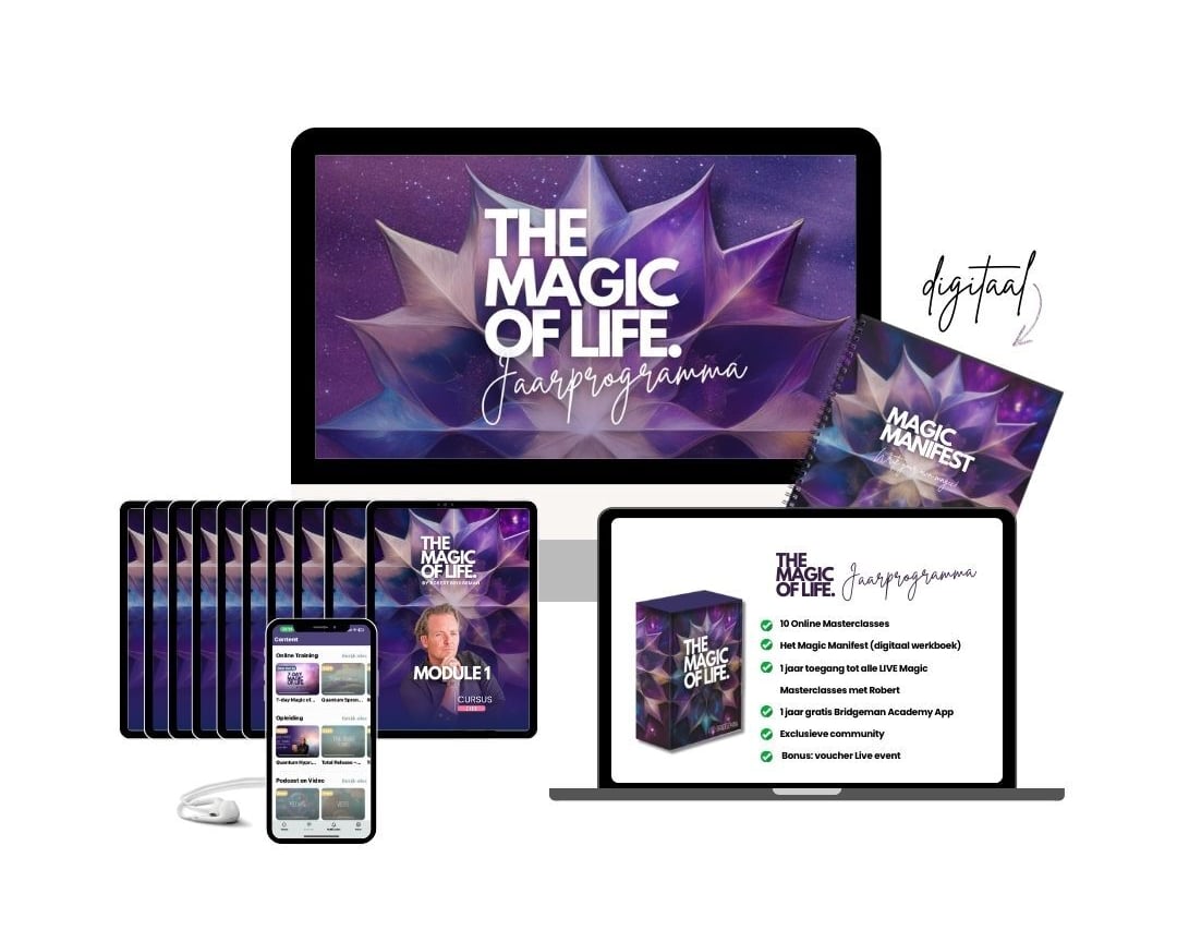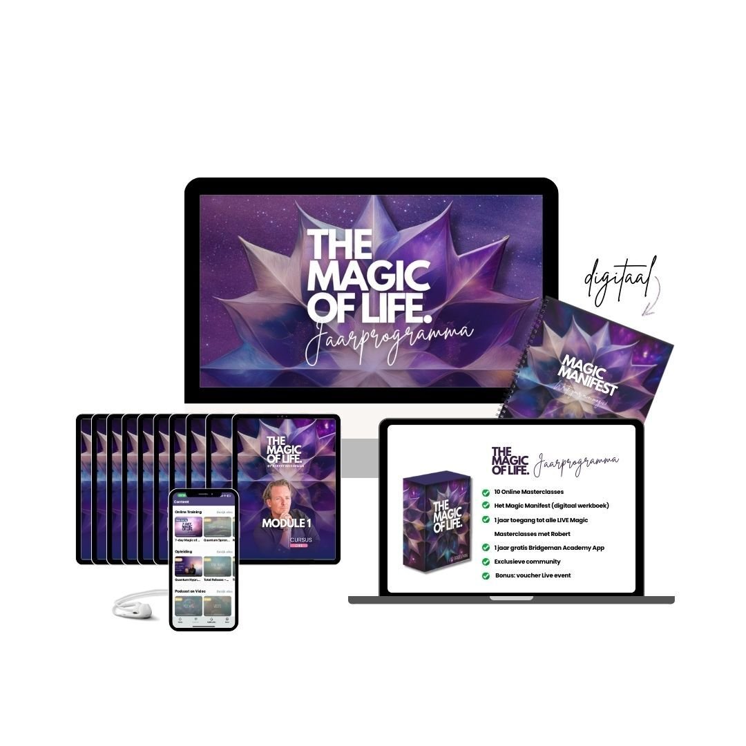 The Magic of Life is een intensief online transformatiejaar met 10 opgenomen masterclasses ondersteund met video's, meditaties en protocollen van Robert Bridgeman, aangevuld met LIVE Online Magic Masterclasses gedurende het hele jaar. Het programma combineert zelfstudie met live begeleiding voor blijvende verandering.